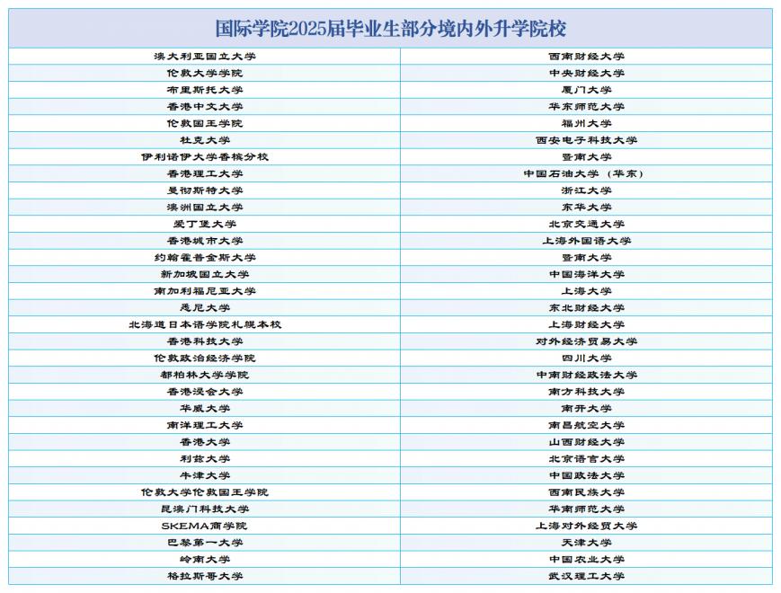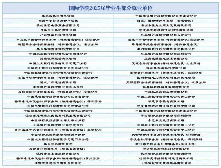 大发娱乐 2025届毕业生有近40%的学生国内升学、出国(境)交流或交换学习,或留学攻读硕士、博士学位;45%左右的学生在国内外从事金融服务业或进驻商务领域。他们当中,有直接就业于华为、美的、普华永道、德勤等世界知名跨国公司,有任职于国家外交部、税务总局等国家公务员岗位;有进入牛津大学、哥伦比亚大学等全球顶尖名校学习,有考取浙江大学、厦门大学、中央财经大学、上海财经大学等国内著名高校继续深造。